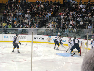 Then last night, thanks to my friend Jeff’s company seats, we got to go to the Predators Hockey game against the St. Louis Blues. We ate dinner at Rippy’s beforehand and then made our way to the seats only a mere 6 rows from the glass (I was uber excited because I have never sat that close before). The game was action-packed with flying pucks headed our direction (a guy 2 rows away actually got hit in the head and the paramedics had to come), a REALLY good fight in the 1st period (hey, it’s not a fun game unless there is a fight), a last second shot to tie us up, and then a final shootout where WE WON!! We all kept reminescing about how much the game reminded us of the Mighty Ducks movie just because of how crazy it was… what a great night in Nashville!!