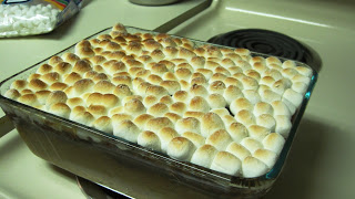 Remove from oven and add marshmallows to cover dish