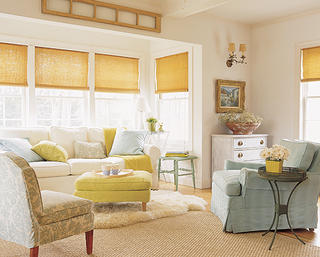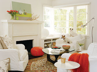 3. Keep things versatile by covering major pieces—the couch, an armchair—in a neutral shade or plain white. Then you can add color and verve by changing out pillows and accessories rather than doing a total overhaul.