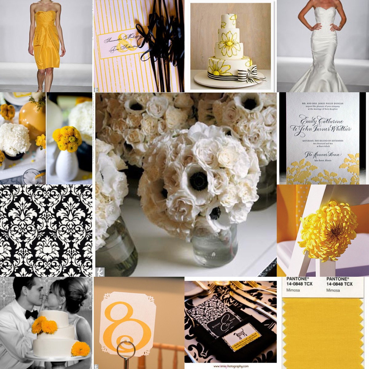 Keep in mind, my wedding is in June, a true summer month, so I wanted a fun color to brighten the decor, flowers, etc… and I love the classic elegance of black and white, especially since our wedding will be an evening celebration! Though I have seen loads of inspiration boards with details I love, I created this with Photoshop and love how it turned out–it’s exactly the ideal look I am going for and I think this matches my “southern soiree” type wedding.