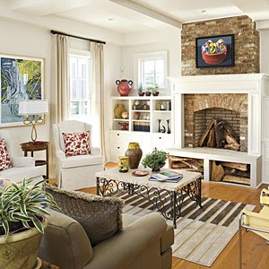 A Relaxing Family Room with Lots of Light and a Working Fireplace!