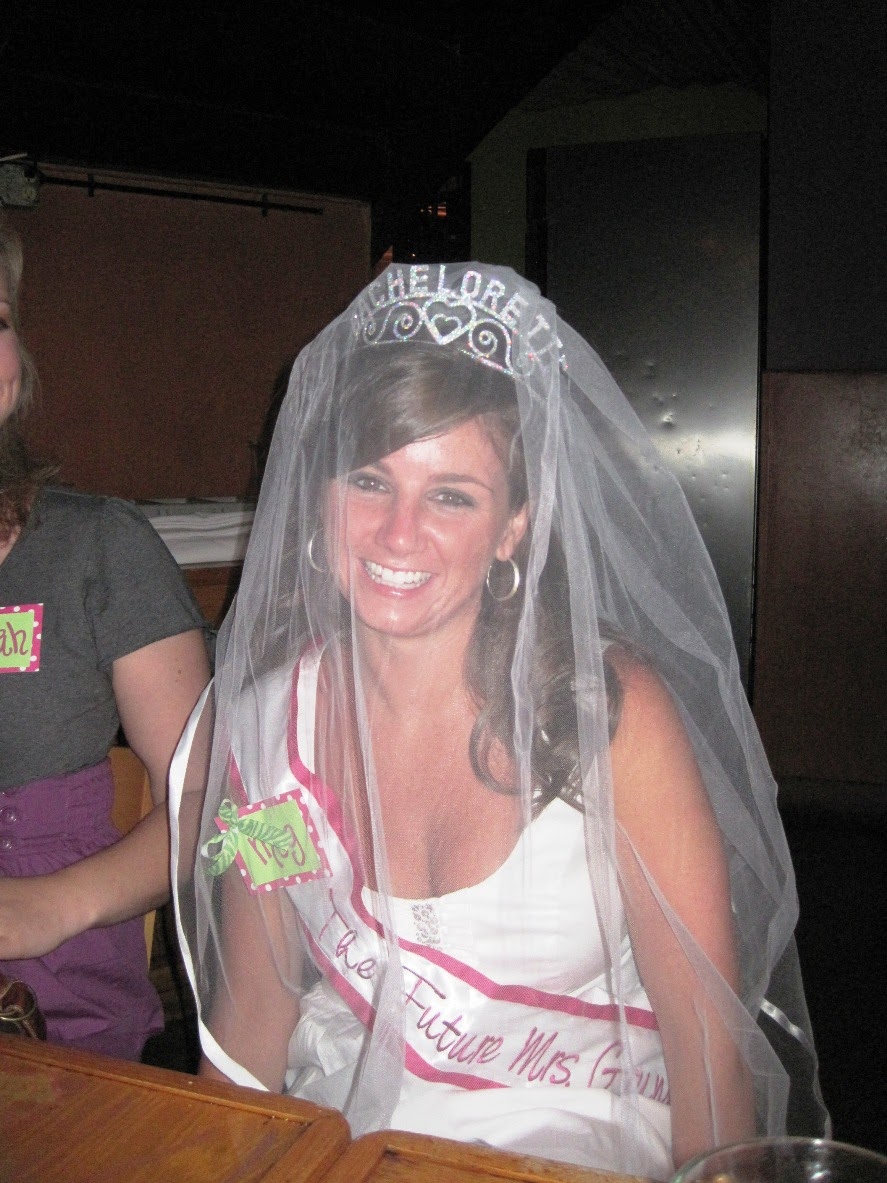Meg’s Bridal Loot–complete with personalized sash, tiara, veil,