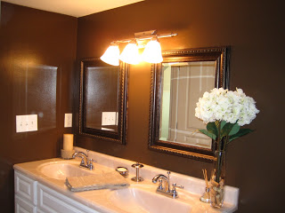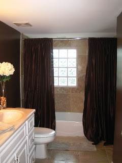 Yes, we had the bathroom repainted again. After the horrid turquoise catastrophe–seriously, what was I thinking–we went back to basics and had it painted Chocolate Swirl via Behr from Home Depot. The color goes perfectly with the tile bath, the bathroom vanity mirrors, and then I used chocolate raw silk draperies as shower curtains since the tub is oversized and taller than a normal shower curtain would accommodate. I brought in some hydrangeas for heighth, a relaxing candlescape, and some new silver bath accessories and muted rugs to keep the “sereneness” flowing… all is left is to find some artwork to display on the walls and find 2 perfect tiebacks and we’ll have another room checked off the list.