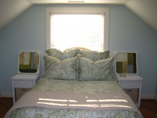 Here it is ladies and gentlemen, the happiness of my heart right now. I have worked my butt off on this room and it is really coming together. Jeff and I reupholstered the headboard ourselves and transformed it from white wicker to gorgeus khaki dot print for $58, had the room painted a color called Ocean Air via Benjamin Moore, and dressed the bed in the Sienna Paisley Print duvet and shams via PB. We bought these 2 yet-to-be-hung prints at ZGallerie and touched up my childhood white wicker with a fresh coat of white glossy spray paint. Now, I am on the hunt for the perfect nightstand lamps, sitting chair for the corner of the room, and some decorating accents before calling this cottage bedroom complete.