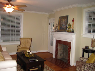 steal have my great-grandmothers tone-on-tone yellow damask arm chair–I am in love with it and it means even more that it is something that has been passed down in my family. In addition, we added a new coffee table via PB, a new zebra arm chair for a little dramatic flair via Pier 1, and an assortment of decorating accessories from all over the place. We need to add a few side tables, a sofa/console table, a floor lamp or additional lighting, and some prints/paintings/pictures on the walls and then our formal living room will be complete!