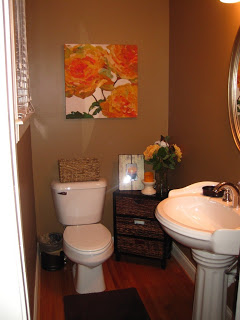 More progress in this little space–a canvas on the back wall, a new floral arrangement for the storage shelf, and a new simple rug to blend the elements together. Now, all I need is a towel rack, a simple sawgrass basket to “hide” the toilet top, and this room will be knocked out as well. Not my favorite room in the house, but it’s a guest bathroom and it gets the job done–haha.
