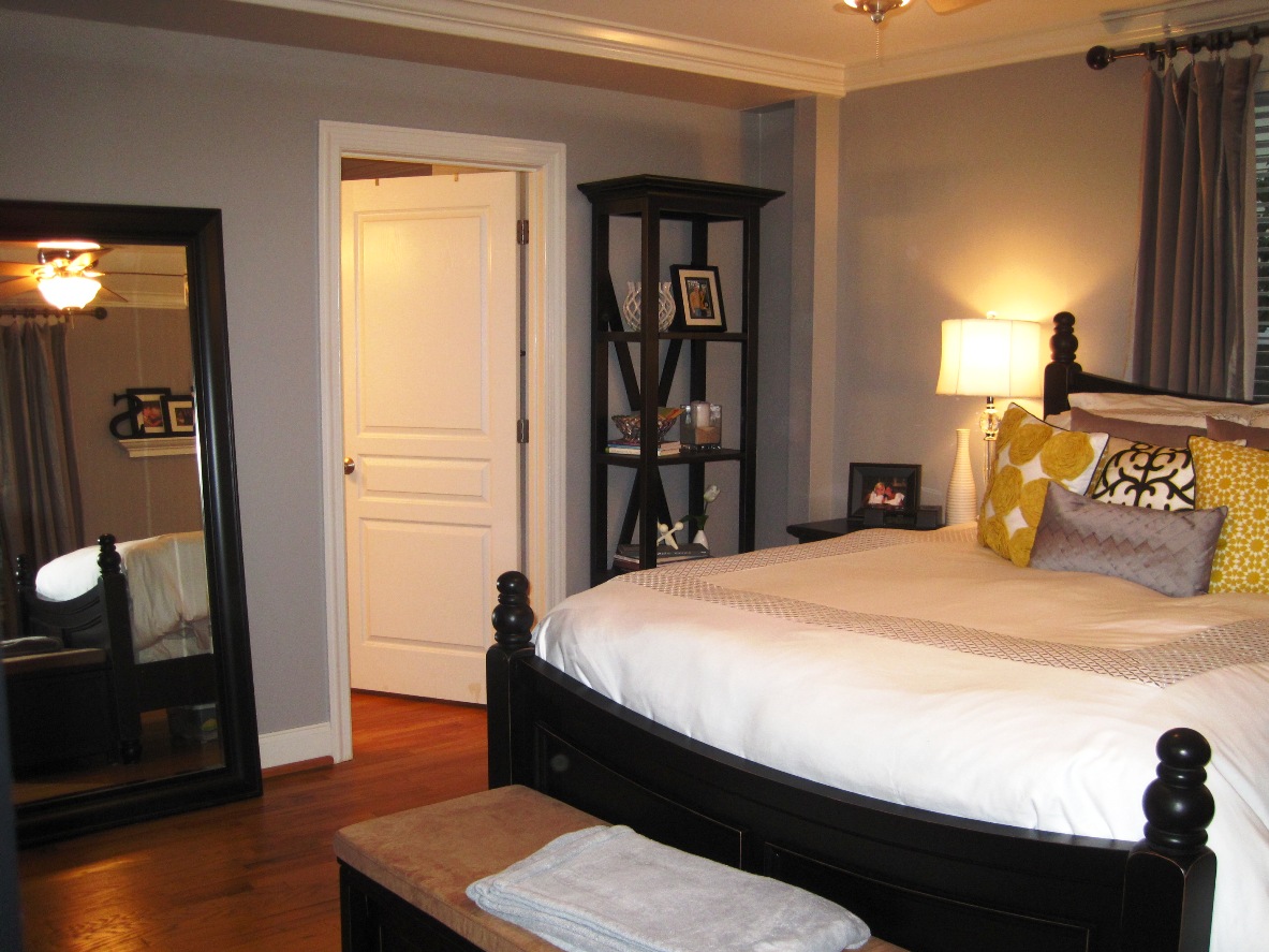 I love all of the wall colors, and the master bedroom looks GREAT! Loving the shelf with the frames and letter "S" – seriously, it all looks so good!