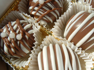 Remove the balls from the freezer. Dip the balls one at a time in the chocolate. Use a spoon/toothpick/egg dipper to slide the ball onto the wax paper tray. Once you have covered all the balls in chocolate coating place the tray in the refrigerator until the chocolate coating is set. At this point you can drizzle other chocolate on the balls for decoration.