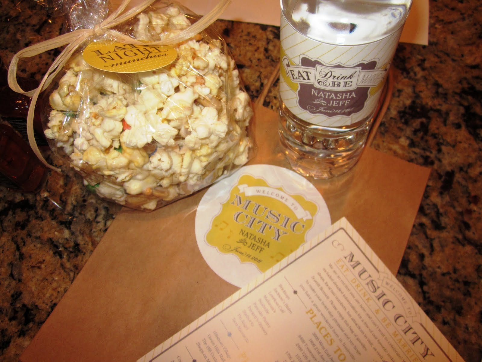 When I started thinking about OOT gift bags, I knew I wanted something that screamed Nashville…also known as Music City USA. I had very specific items I wanted to include, and started off on my quest to purchase fun items to make these unique for guests that were sweet enough to travel to TN for our big day. Without further adieu, here they are: