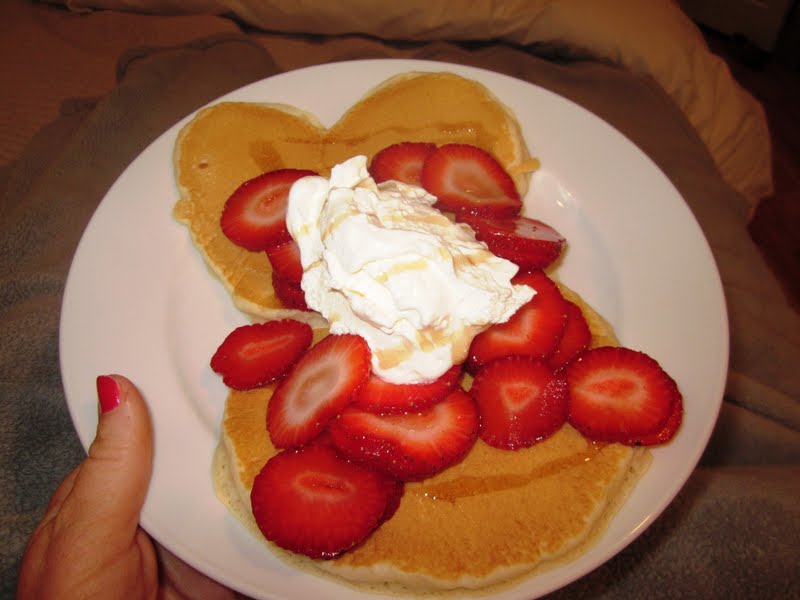 Sunday, I was woken up early for one of my favorite past-times…breakfast in bed. My adorable Jeff made pancakes in the shape of hearts and topped them with strawberries and whipped cream–so sweet!