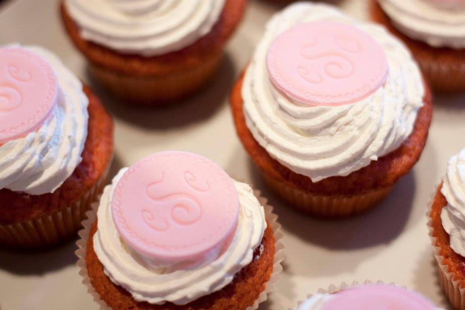 Strawberry cupcakes with fondant monogram toppers