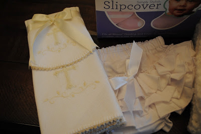 Bib and burp cloth for her baptism as well as ruffled bloomers from Mimi
