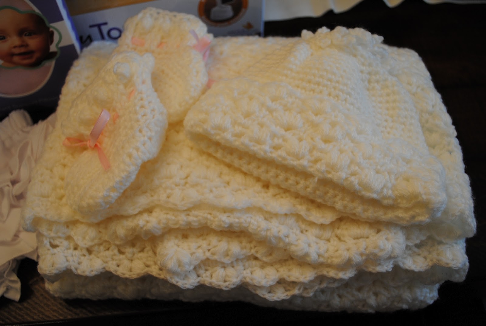 Pink and white crocheted blanket from Mimi