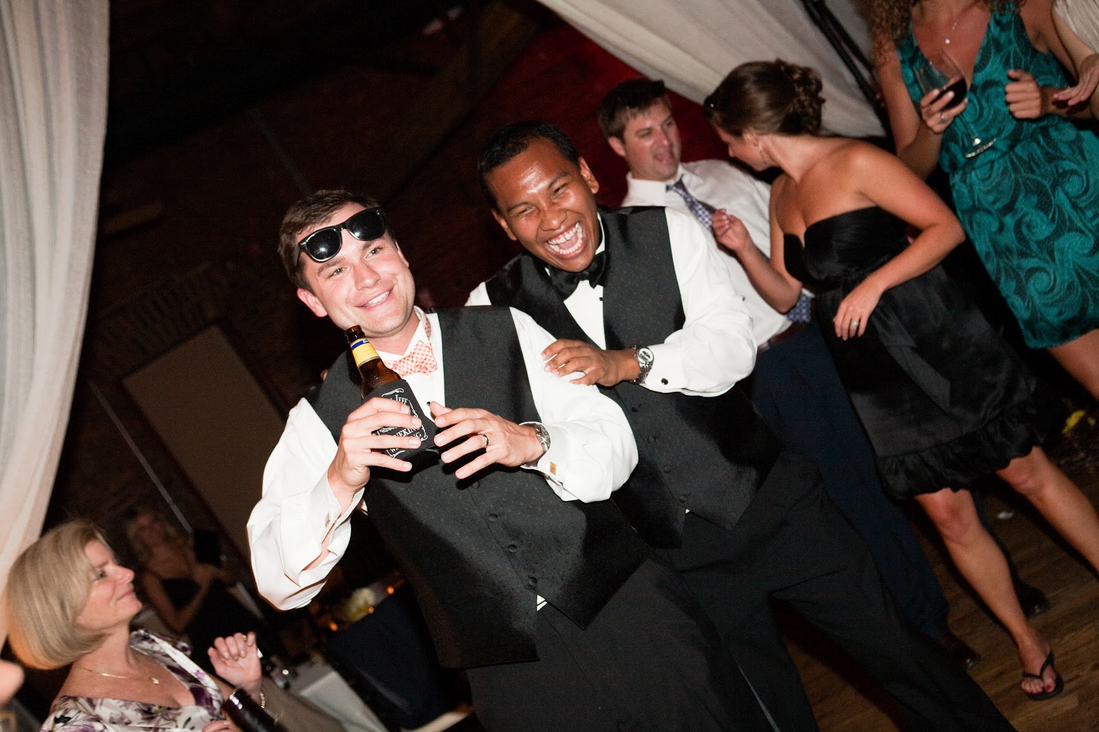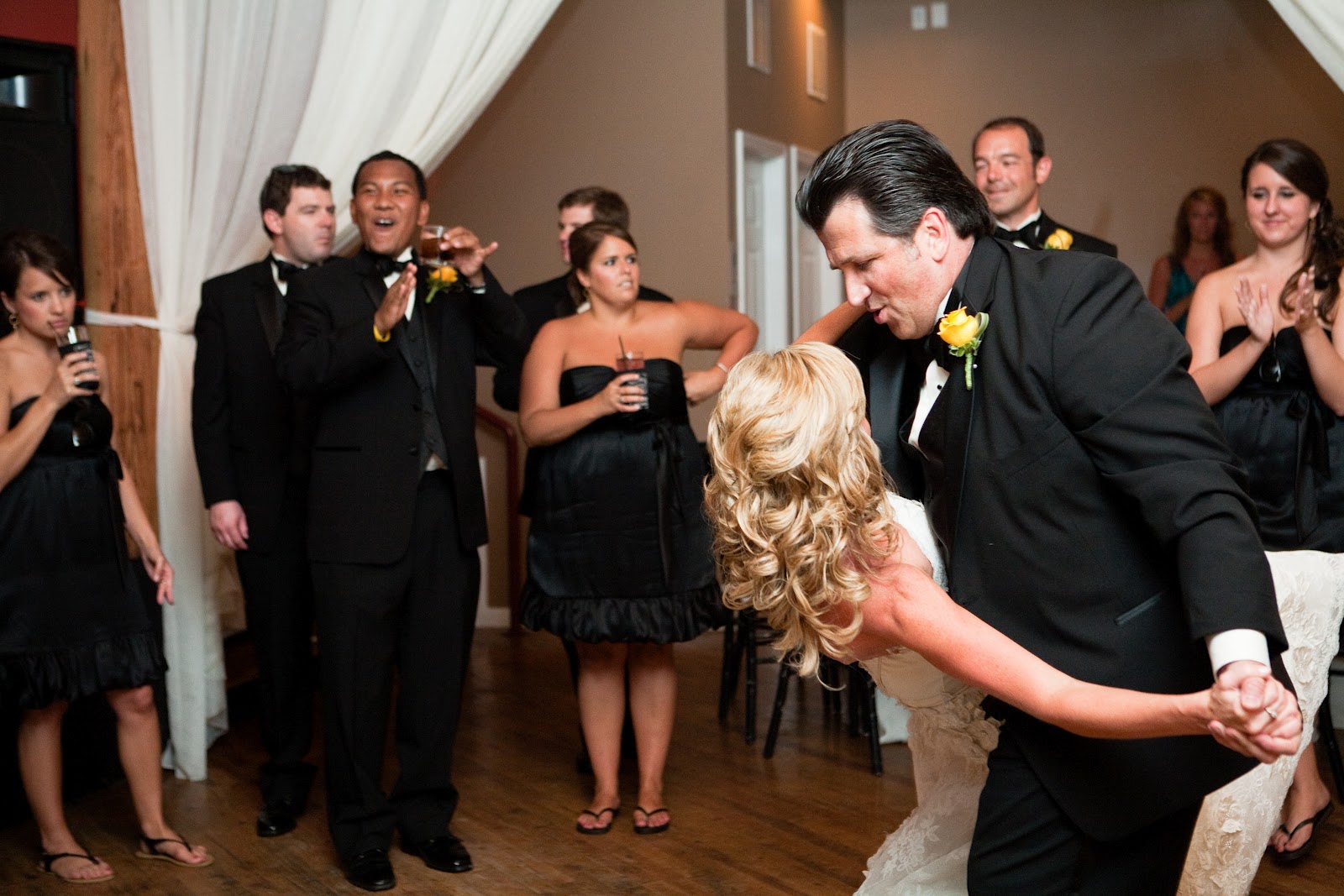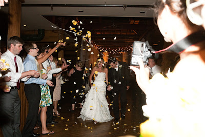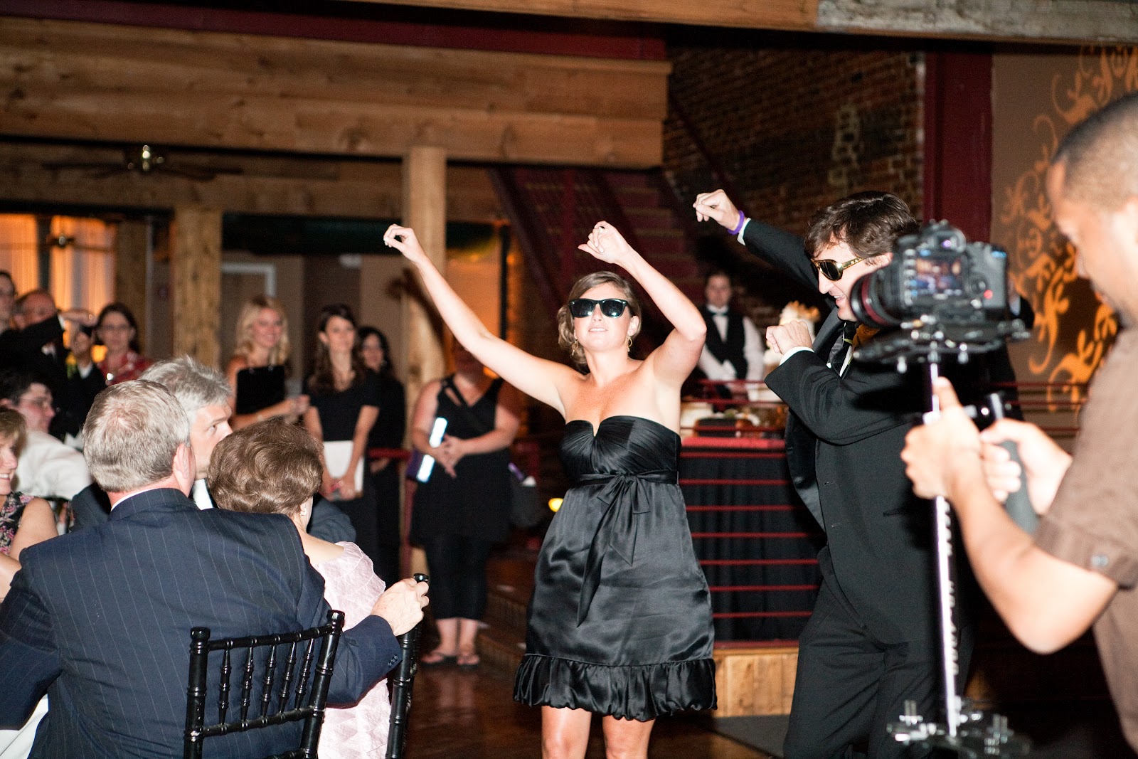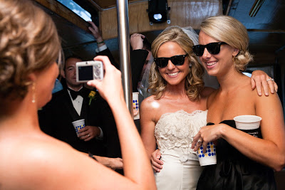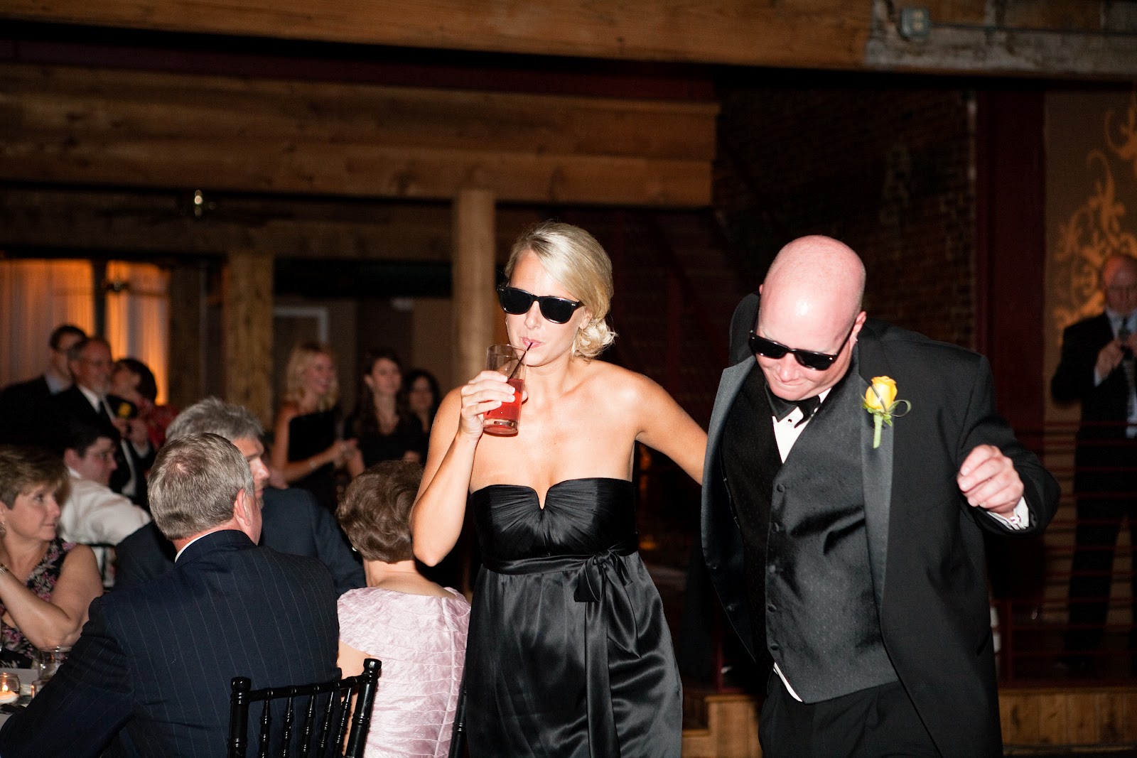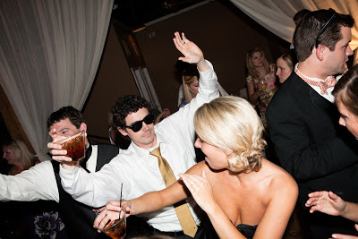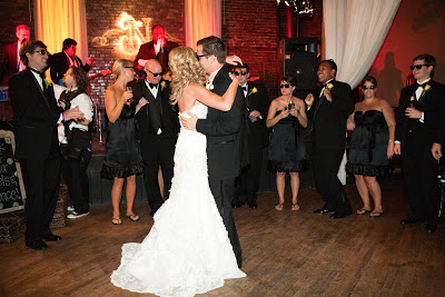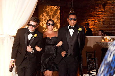 The Bridal Party Entrance: take the “traditional” out and you have exactly what we went for…we wanted a fun entrance, and one of our favorite rap songs just so happened to incorporate colors from our wedding (Wiz Khalifa’s Black and Yellow)-hilarious! We had ordered 50+ pairs of wayfarer sunglasses for everyone {thanks to my Dad} and our bridal party entrances were the perfect way to get the party started.