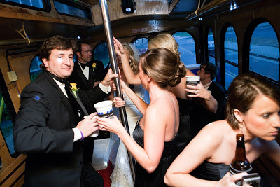 The Transportation: we wanted something fun, casual, and large enough to accomodate us as well as our bridal party…trolley time! Add a fun mix CD + loads of “adult drinks” + dancing pole = FUN!