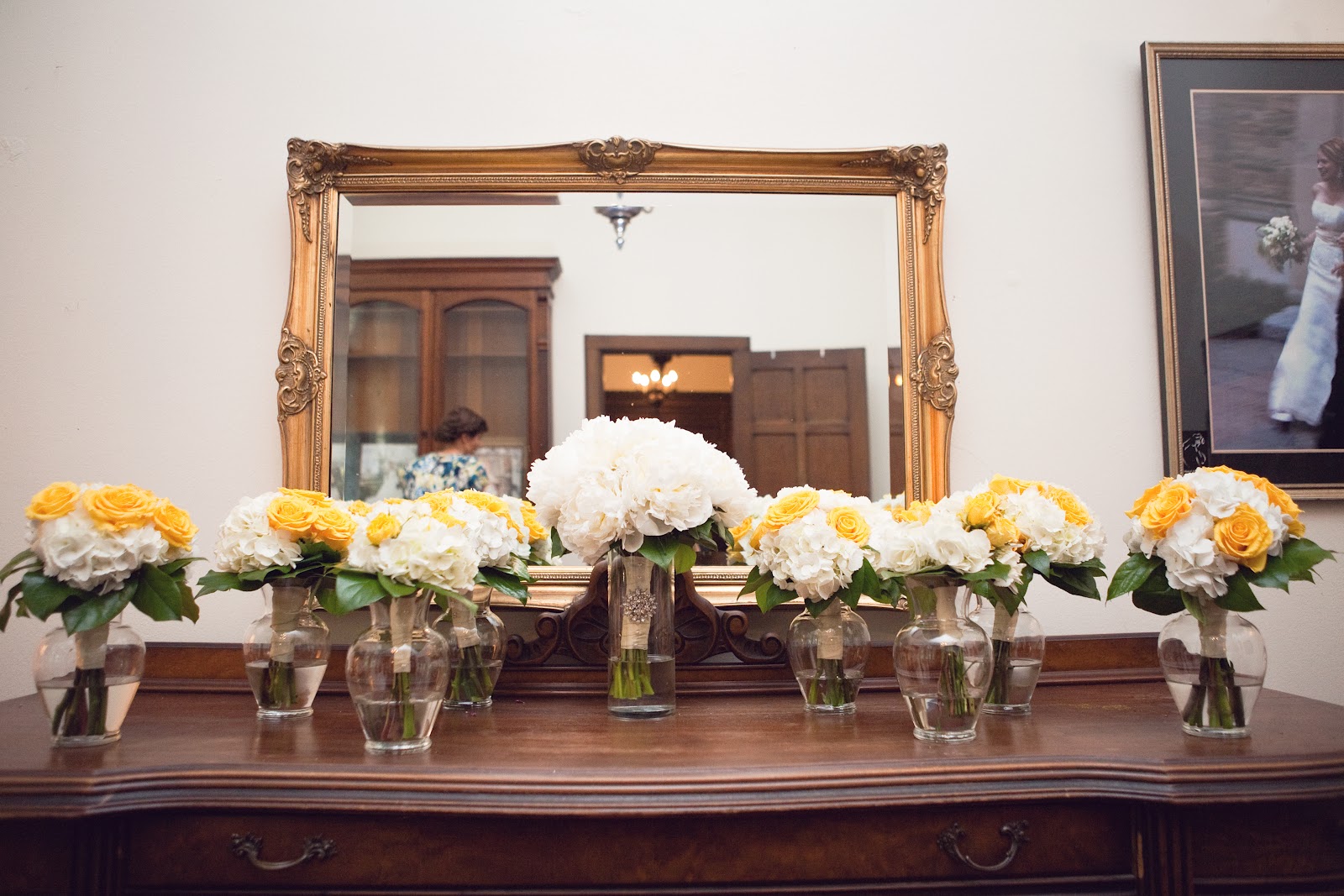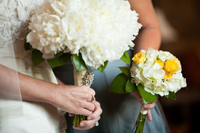 Bridesmaid bouquets: white hydrangea/sweet yellow roses via Enchanted Florist