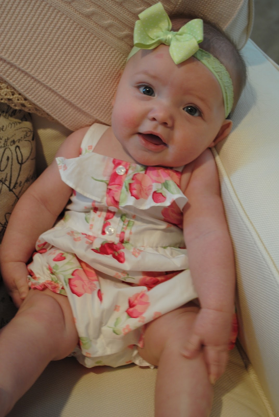 we don’t go to the doctor this month, but my guess is that you weigh around 16 pounds, which helps give me a great arm workout each and everyday since you LOVE to be held. you are still in size 2 diapers and are in 3-6 month clothes…yes, i had another meltdown as we finished putting away all the smaller size frocks. i want this time to slow down because i know deep down inside you’ll never be this tiny again and it breaks my heart. i want this to last forever! i am trying to document all your milestones as frequently as possible, and we have taken some wonderful videos and captured tons of sweet, sweet pictures so we can eventually show you just how precious you were at such a young age.