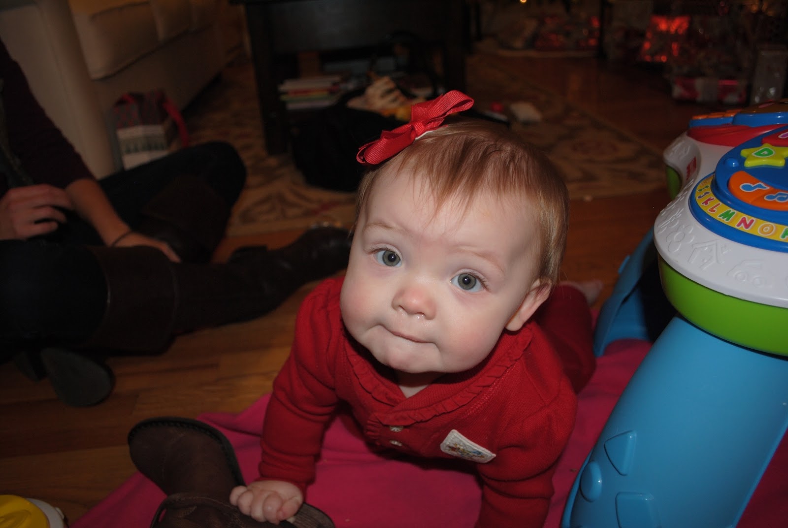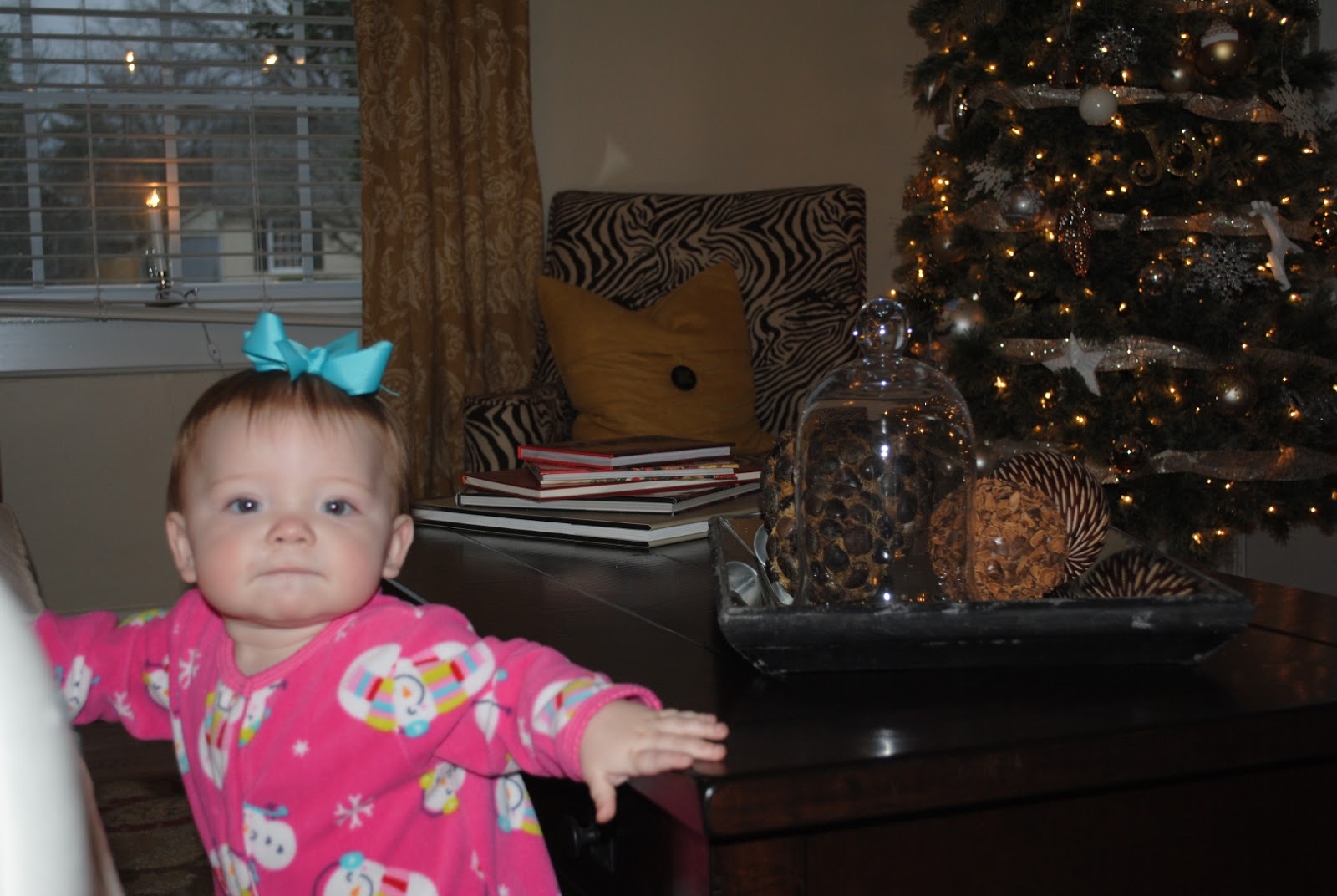 What’s Going On. This past month was a big one for you. You had your first plane ride to Los Angeles (how fun is that!), met your great-grandmother for the first time, stayed in a hotel, and this week, you’ll meet Santa Claus just in time for Christmas. You are pulling up/cruising around the entire house and getting into every.single.thing you can get your hands on…frequent favorites are kleenex boxes, empting all the DVDs out of the media console, and playing in the wrapping paper and boxes we have on hand for presents. Other favorite time occupiers are your musical table, the jumping exersaucer, dancing while I sing “jump shake your booty”, hanging out in your pack and play, and playing with Chloe (our dog). Bath time is still another nightly essential and you kick your little heart out, splashing water everywhere, but we don’t mind. It’s our favorite ritual that we always do together and you love it. I know wholeheartedly you’re going to be a water baby! You have learned how to wave “hi” and do it all the time to everyone we see…it’s adorable and I can’t get enough of your amazing little personality.