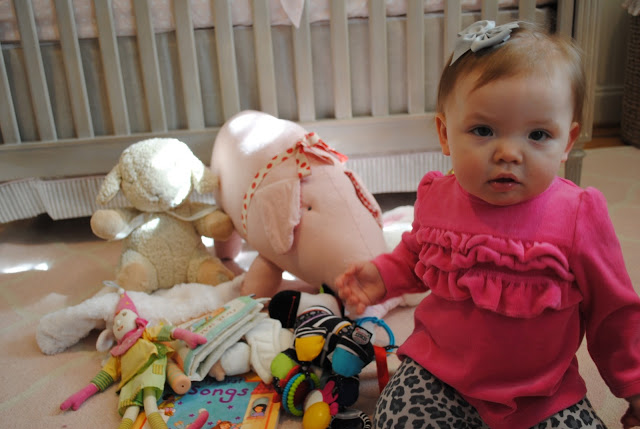 She is just so darling! Love her little outfit and pose at the end. Cannot believe that she's 10 MONTHS already…seriously…where has time gone? And I love that cute piggie in the background…where did you find it??