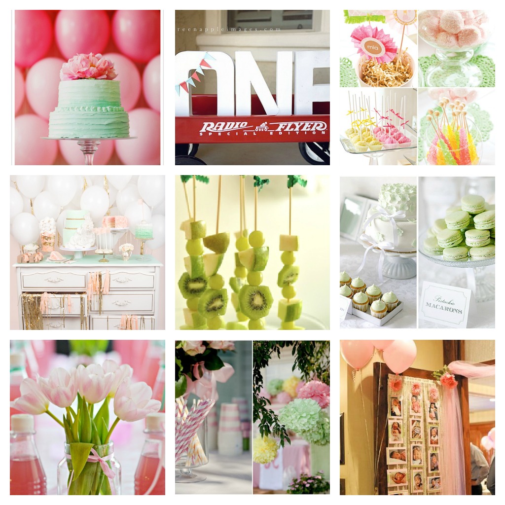 I started pinning all sorts of fun images to coincide with the color palette I was thinking…mint green, coral/preppy pink, and white. Fresh, pretty, and feminine colors for spring that we can do a lot with in terms of decor, food, and all the party necessities. Here is an inspiration board of what I came up with: