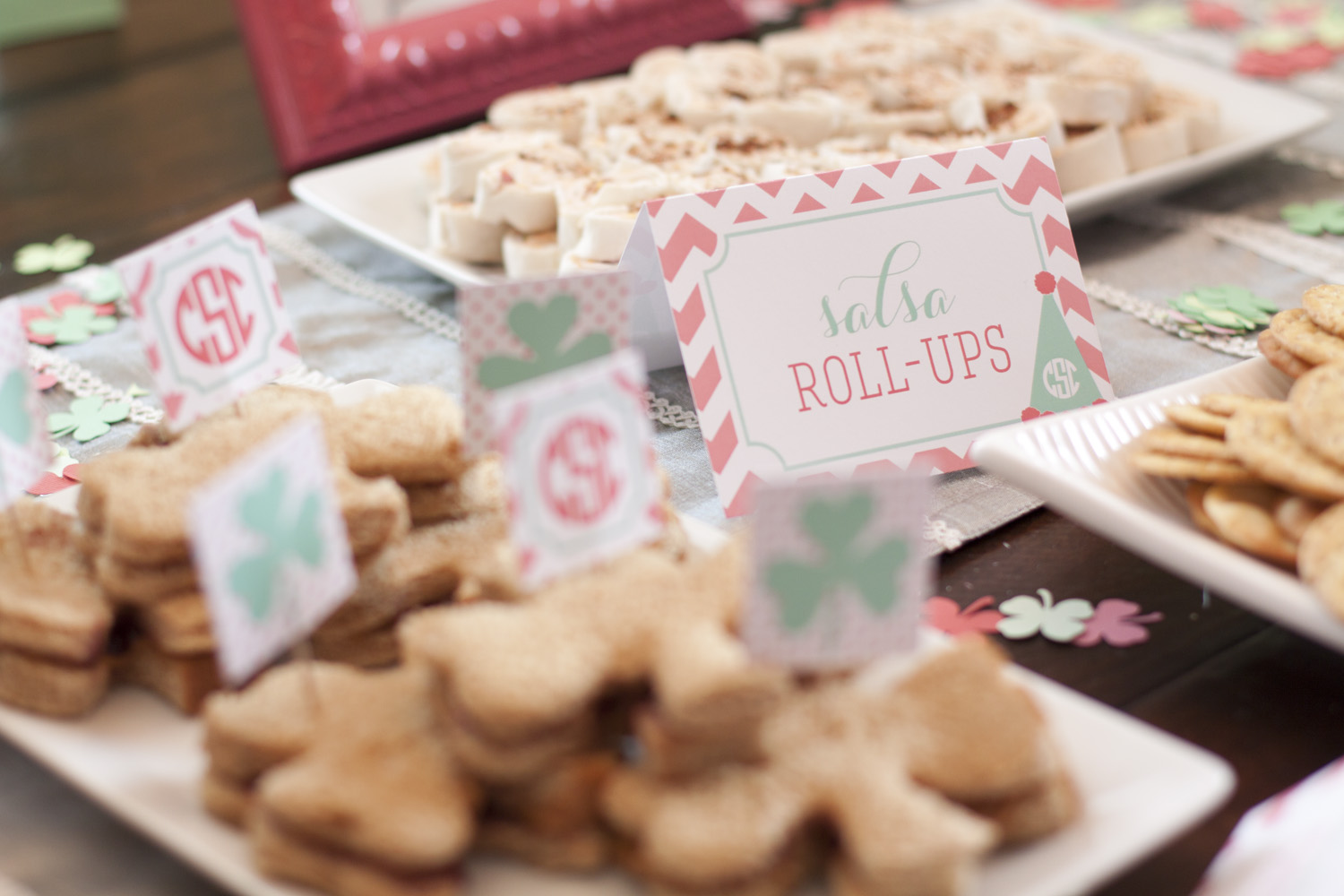 Next up, the food…we made a few appetizers, desserts, and drinks for our guests to enjoy! Those recipes to follow in another post because most of them were great, as I made them the day before to help save time on party day. Mom made the party favors for everyone to enjoy, a Lucky Charm Snack Mix, and they were so tasty, addictive is a better word to describe them. We also rented a local food truck to come serve custom order hamburgers and french fries for the big day…Hoss Burgers was incredible and I cannot say enough great things about their service and helpfulness-they were lifesavers and made cleanup so much easier, not to mention I think Jeff was elated he wasn’t having to grill all afternoon! We also made a few shamrock shaped PB&J sandwiches for the little kids in attendance-wanted to make sure they were fed something they liked, too! As for the cakes, I ordered those from my favorite local bakery/restaurant, Puffy Muffin, and they sure didn’t disappoint-butter cream ruffled icing with strawberry cake…AMAZING!