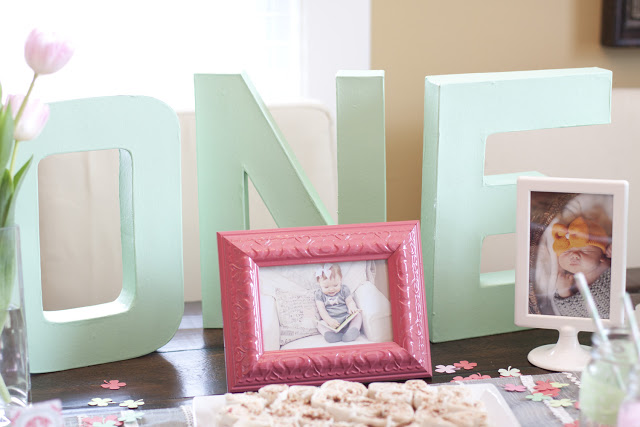 First up, the decor…I went a little nuts when it came to decor and I know it. I started working on all the details way back in December, gathering bits and pieces as I saw them from local stores and I couldn’t resist. I made the rag garland for the fireplace mantle and the chandelier, crafted a DIY paper chain backdrop for the sweets table, decorated our favorite chalkboard with all of Caroline’s stats, painted “O N E” letters to serve as table decor, and added fresh flowers all around the house for some springtime festiveness and color. Mom was even kind enough to spray paint her wooden high chair pink for Caroline’s big smash cake fun, too!