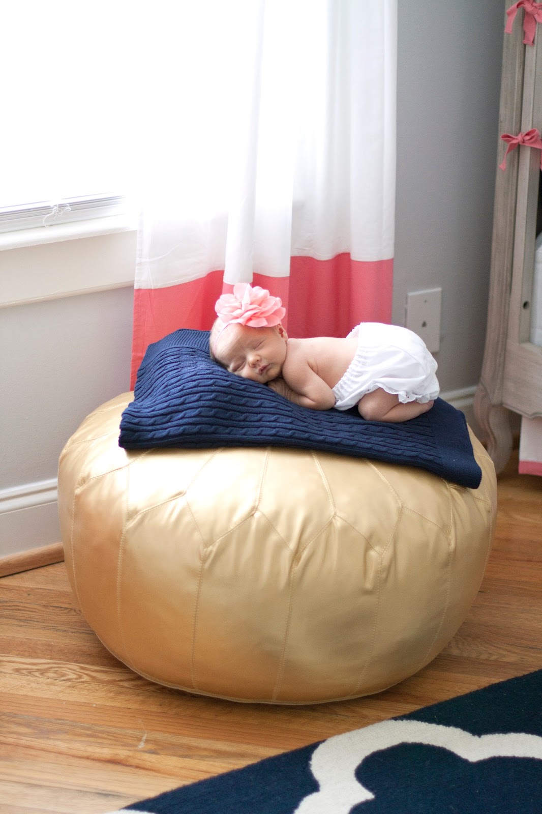 her nursery appears to be the same colors of our wedding scheme! it was totally my dream to have our girls nursery reflect that, but now were having a boy! love her gold pouf. she looks so tiny and precious! these are great pics!
