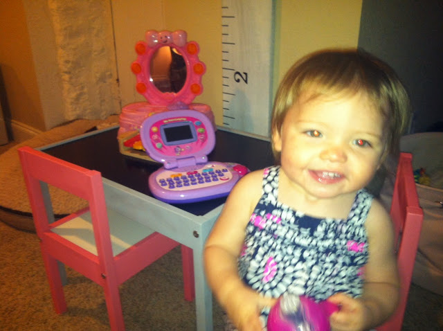 (if I say so myself) and I love the finished product…and yes, Miss CC does too. She is constantly working on her computer, stacking blocks, getting ready in front of her mirror, and climbing up and down the chair. It’s a BIG hit in our house. Yes, this is a horrible picture, but you get the idea 😉