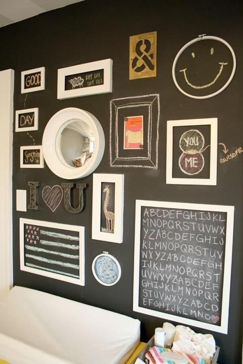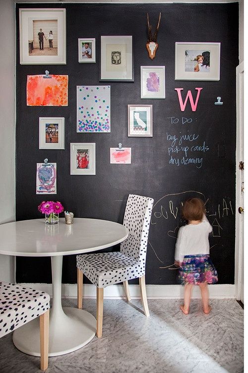 Just adore that chalkboard wall with the gallery wall on top of it!