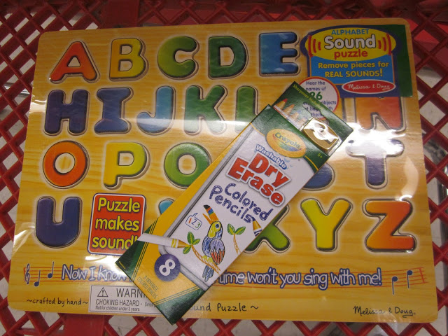 I picked up a few essentials while I was there, too. Something I had never seen before were Dry-Erase Pencils from Crayola (of course those were instantly added to my basket) and then I picked up a wooden puzzle by Melissa and Doug as we have started working on our alphabet/letters with Miss Caroline.
