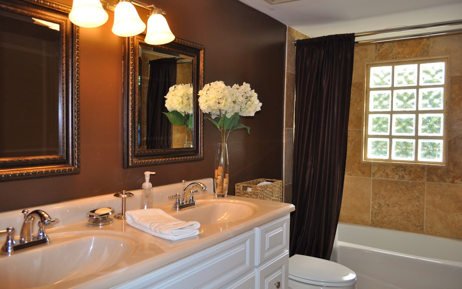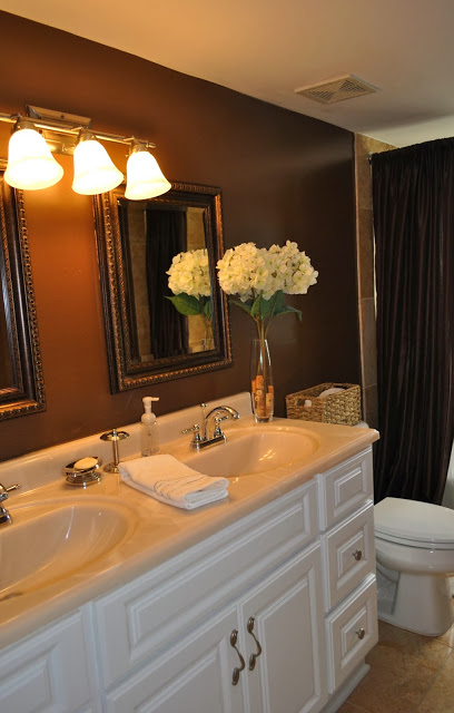 Love your guest bathroom. The dark color makes it look so glamorous. And I love the floral bedspread in the guest room. Beautiful colors.