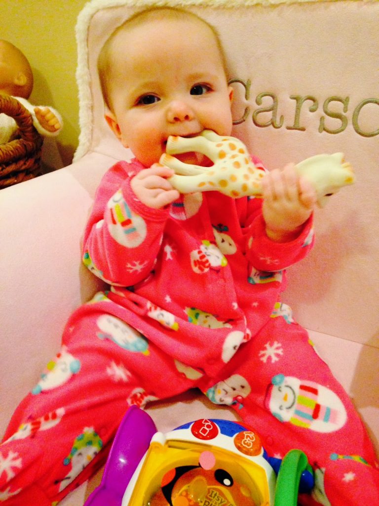 She's so darn cute–I'm sure that at least HELPS in times like this! Hang in there, momma–it'll get better. My daughter (Adrienne) also has major disruptions when teeth are coming in…and it's not fun. Happy 7 months!!