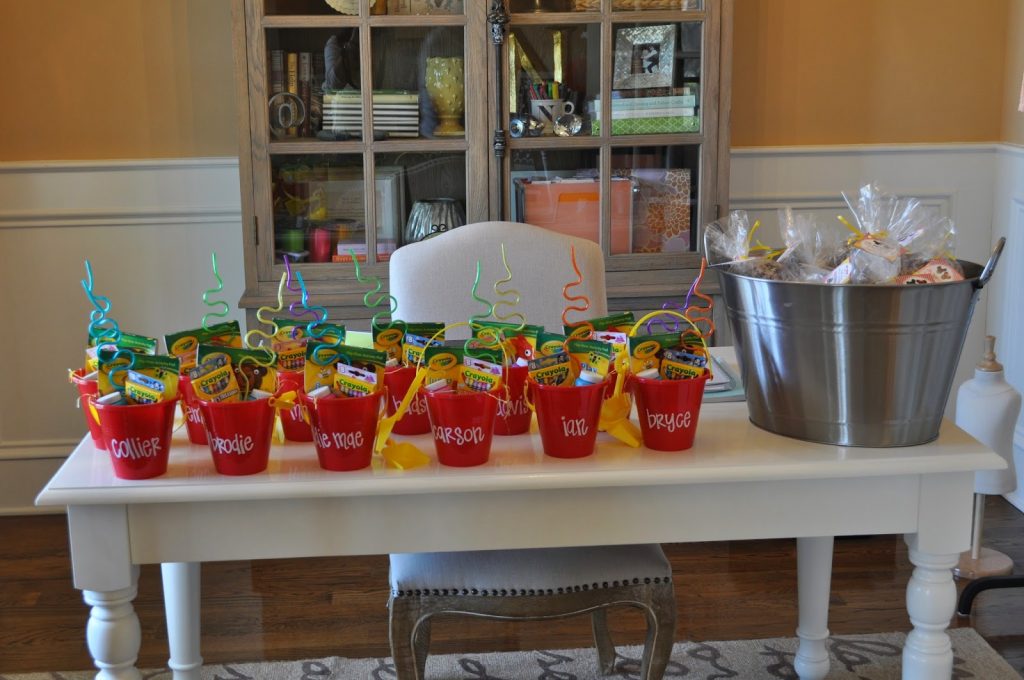 the favor table…personalized mini beach buckets with crayons and coloring books for