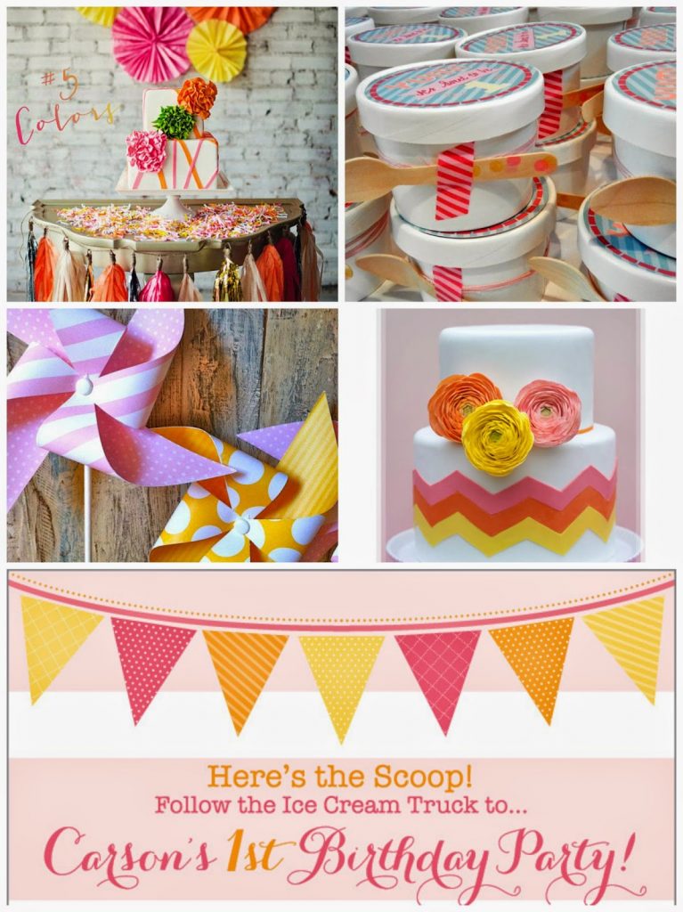 Anyways, to celebrate Little Bit’s big first birthday, I knew about six months ago that I wanted to do something with ice cream! Nothing says summer like ice cream and we sure do love our two scoops of fun. I went with a bright, bold color scheme of pink, orange, and yellow and then sent Beth Hart my ideas so she could come up with just the perfect invite. Of course, she amazed me as always and it was perfection! Here is the inspiration board for Carson’s Ice Cream Social:
