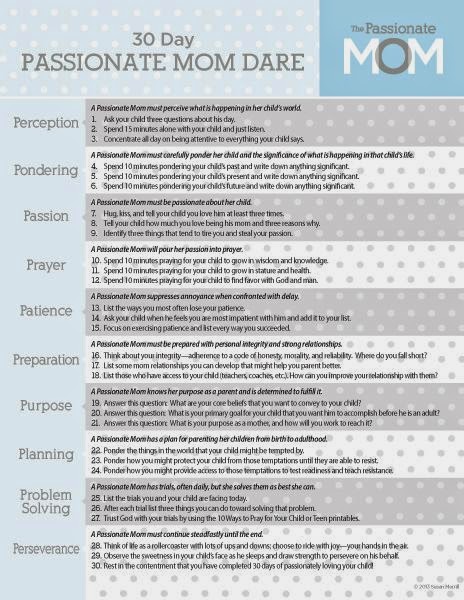 I then found her 30-Day Passionate Mom Dare and thought this was something that is not only important, but something I want to genuinely try to incorporate more into my life. Some of these actions require more time, but I know I can learn a lot more about what my children need, think, and feel. Can’t we all be a little more passionate??