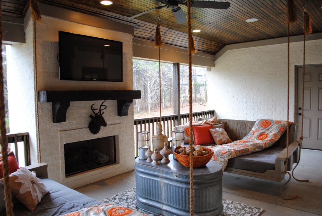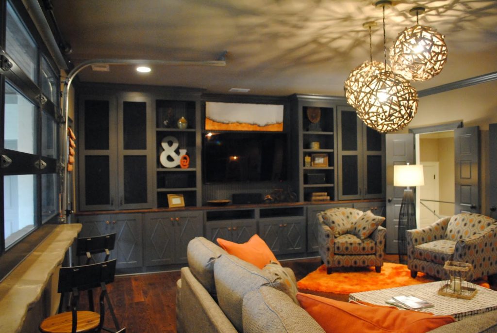 By far my favorite media room ever…complete with an opening garage door to access the covered porch