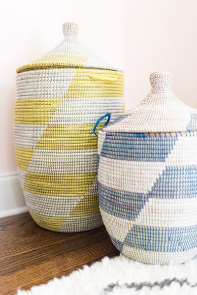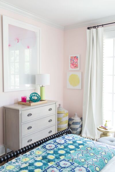 The room is gorgeous – all the mix of colors while still being so light and airy! Those baskets and that rug are my favorite. And the bow pillow!