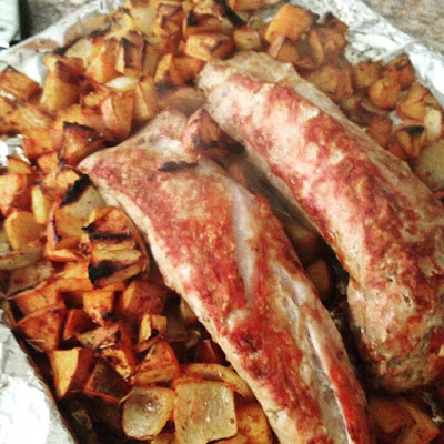 2|| Meanwhile, chop apples, sweet potatoes and onions. Toss in oil and spices. Arrange on sheet tray around pork roast.