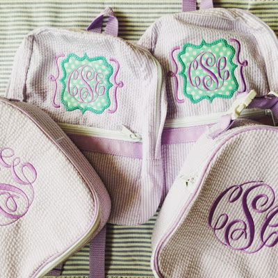 Thankfully, I had my favorite gal Chic-a-dee Embroidery whip up brand new matching backpack and lunchbox sets for the girls so they could go back to school in proper form, with monograms and seersucker, of course! Aren’t they too cute?? Love the color combination, too.