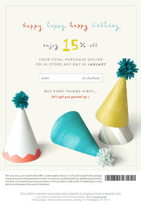Anthropologie || Anthro isn’t one to throw out the coupons all too frequently, so when this goodie pops up for your birthday, it’s reason enough to jump up and shout with glee… a 15% off gift certificate?? Check yes and then check out your favs from this wonderland.