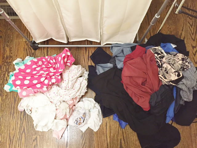 We try to do a small batch of Landry each night during the week night to prevent pile up. One batch ensures that we can wash, dry, and put away without having it pile up!