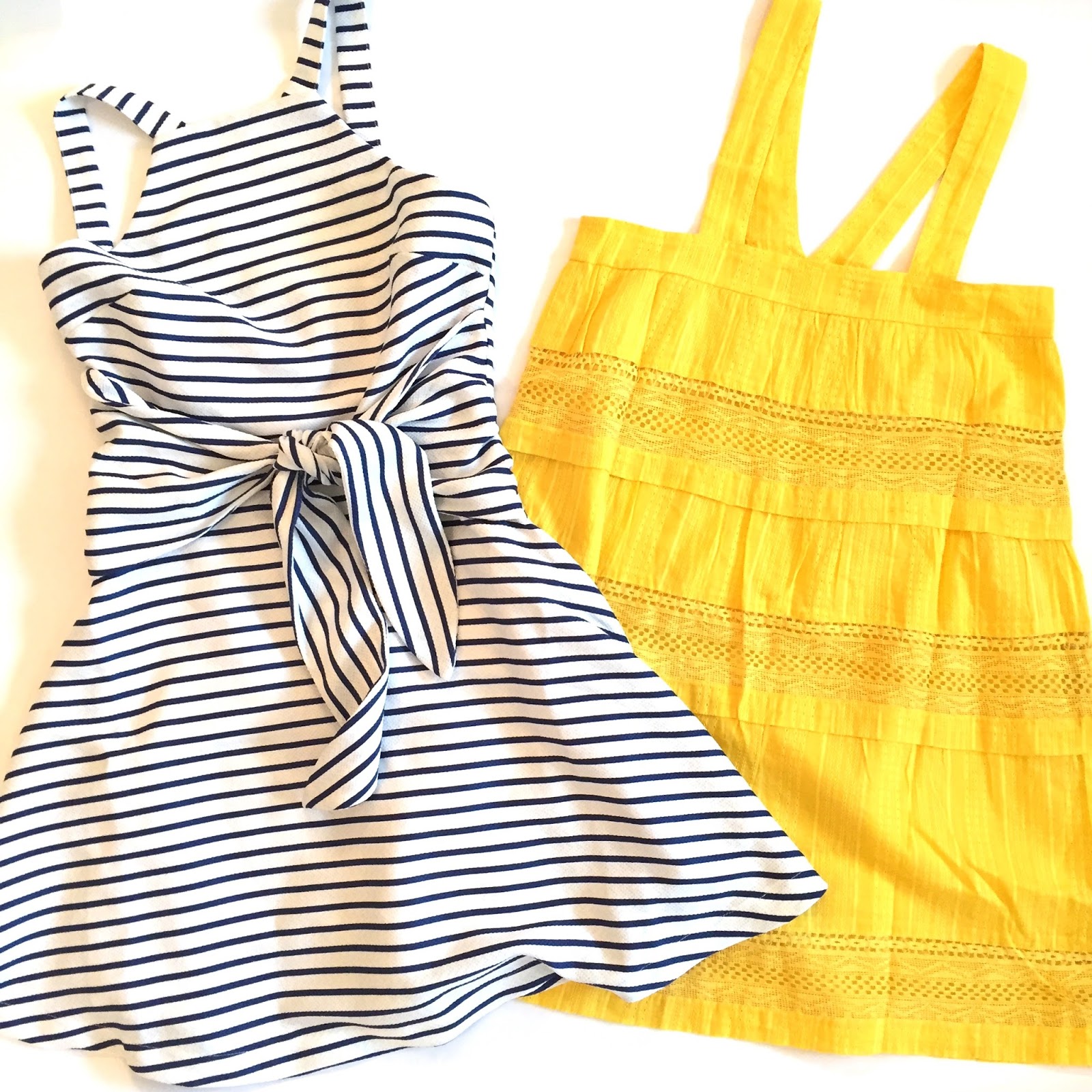 the striped one is a bit fitted and the bow belt ties so it def gives the illusion of a small waistline! as for the yellow… it's more of a shift/boxy type… shorter in length, too!