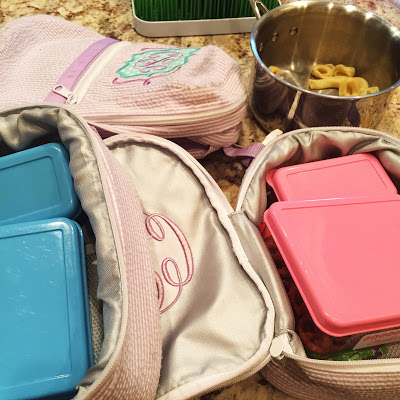 P.S. seersucker backpacks via Chic-a-Dee Embroidery and Food Containers via PBKids.