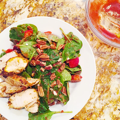 Blackened Chicken and Strawberry Salad via Cherry on My Sundae. It was a little more labor intense than my normal salad mixes, BUT the homemade strawberry vinaigrette dressing more than made up for the extra steps. Perfect summer dish for so many occasions.