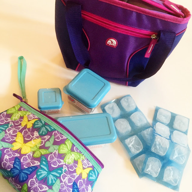 For Carson, she wanted something she could carry over her shoulder [like her beloved purses] so she selected the Hot Brights Mini Tote in Purple. It features a front zipper pocket for her utensils, and a large main section for storing her go-to lunch, consisting of sausage and pesto tortellini, pretzels, blackberries, and carrots with dipping sauce. And last but not least, these Maxcold Natural Ice Packs keep those fruits and veggies fresh and chilly so they are good to eat at lunchtime.