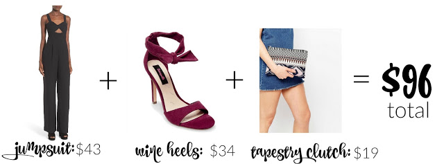 For the final look, let’s think of a fun girl’s night out or a dressy event where you want to make a statement.. you know my mind instantly goes to a jumpsuit because they are a bit edgy and nothing says party like a one-piece… add in some super fun wrap heels and a tapestry clutch and this ensemble is anything but boring!