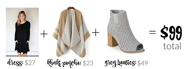 Gray Monroe to show you this cute little number I scooped up last week, the Willow Dress in Black. It’s versatile WITH pockets, and a swing style we all need as we transition to fall and winter. Add in a fun color-block poncho in other neutral shades, then some oh so special peep toe booties and I’ve even got a $1 to spare.