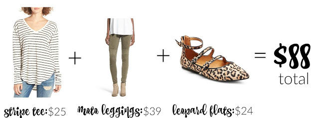 Second in line… Are you looking for something you can wear for everyday errands, a casual work environment, or to participate in weekend fun?!?! This next ensemble starts with an essential v-neck striped tee, the latest and greatest in stretch moto olive leggings, and then I added in some leopard flats for mixed pattern love. $88 for the entire outfit = cheers to that my friends!