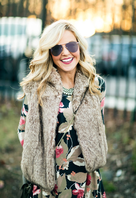 Love this floral dress and the fur combo!! It's stunning!