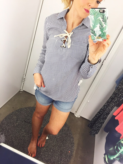 I have been eyeing up those strawberry jeans! And that lace up top with the shorts is the cutest. YAY for cute new fall clothes!